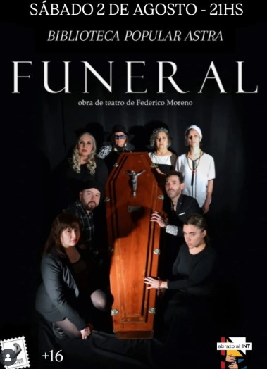 Una propuesta teatral única donde te convertirás en un «voyeur de funerales». Una familia (des)integrada se reencuentra en clave tragicómica, mientras el público recorre la liturgia de la muerte, con algo rico para picar y un vinito. Fecha: Sábado 2 de agosto Horario: 21:00 hs Lugar: Biblioteca Popular Astra Reservas: 2974359112