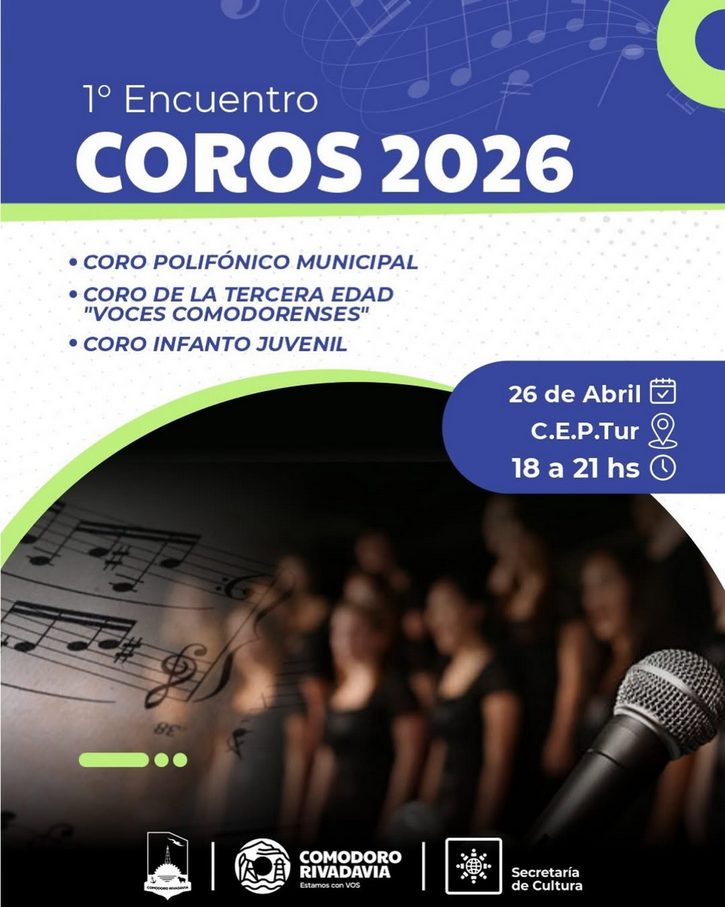 Participan nuestros coros municipales con repertorio popular, académico y patagónico. Fecha: 26 de abril Lugar: Centro de Exposiciones y Promoción Turística (CEPTur) Entrada libre y.