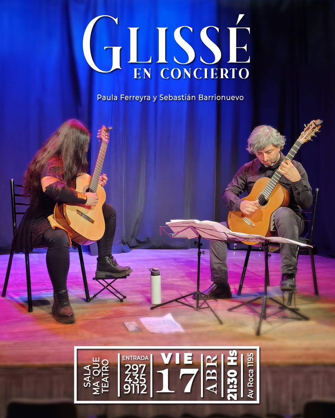 Concierto en dúo de guitarras Fecha: viernes 17 de abril Horario: 21:30 hs Lugar: Sala Ma’ Que Teatro (Av. Roca 1195) Entradas: 297 4359112