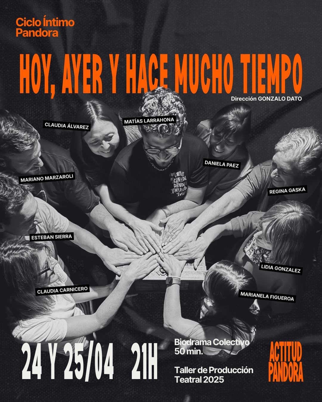 Dirección Gonzalo Dato Biodrama colectivo. Duración: 50 minutos. Fecha: Viernes 24 y sábado 25 de abril Horario: 21:00 hs Lugar: Sala Actitud Pandora (Viamonte 975)