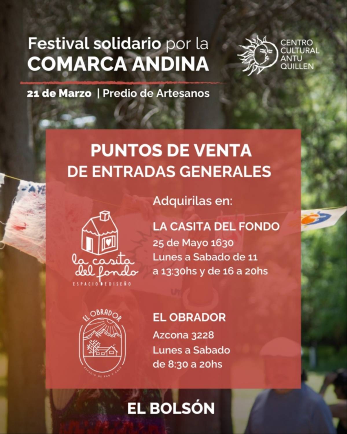 Los vecinos de Epuyén también podrán adquirir entradas con un 50% de descuento, mientras que el público en general podrá adquirir su entrada por 20.000 pesos a través de puntos de venta físicos como La Casita del Fondo en El Bolsón, El Obrador y la plataforma digital alpogo.com.