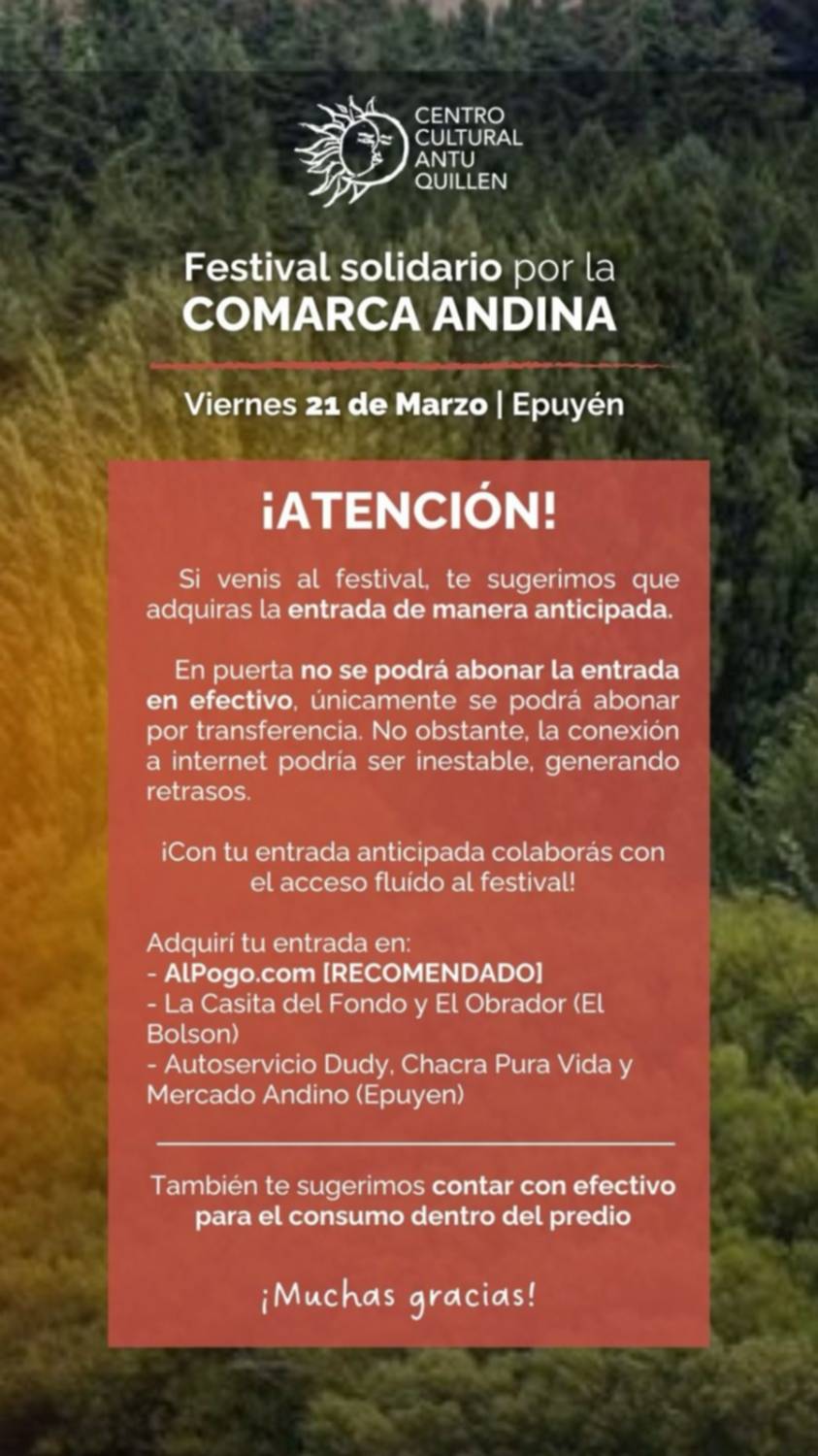 Los vecinos de Epuyén también podrán adquirir entradas con un 50% de descuento, mientras que el público en general podrá adquirir su entrada por 20.000 pesos a través de puntos de venta físicos como La Casita del Fondo en El Bolsón, El Obrador y la plataforma digital alpogo.com.
