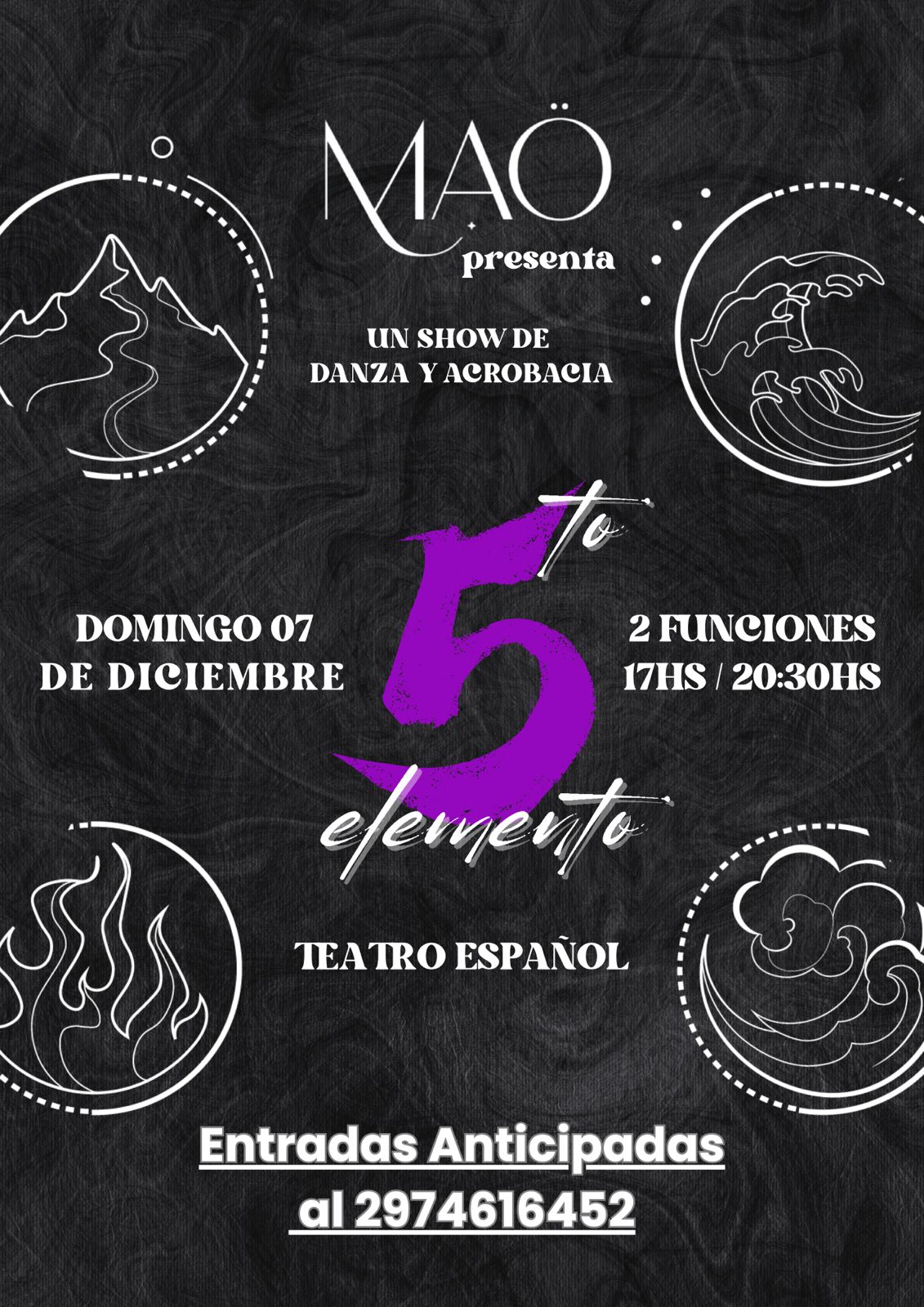 5to Elemento, un show de danza y acrobacia Fecha: Domingo 7 de diciembre Primera función: 17:30 hs Segunda función: 20:30 hs Lugar: Cine Teatro Español Entradas anticipadas al: 297