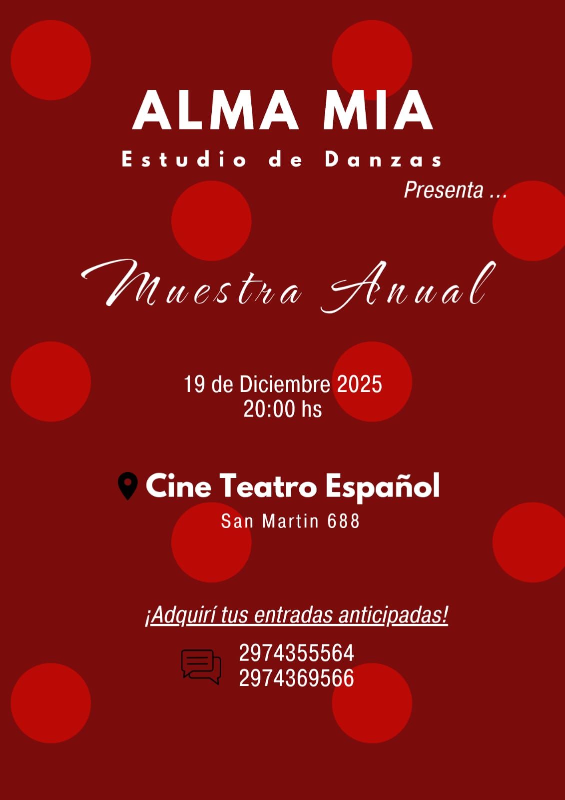 Alma Mía Estudio de Danzas presenta su gran muestra anual Fecha: Viernes 19 de diciembre Horario: 20:00 hs Lugar: Cine Teatro Español Entradas anticipadas:    Whatsapp: