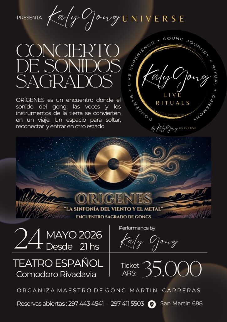 Un concierto diferente, una experiencia sonora inédita en la Patagonia. Fecha: 24 de mayo Horario: 21 hs Lugar: Cine Teatro Español Organiza Maestro de Gong Martin Carreras Venta de