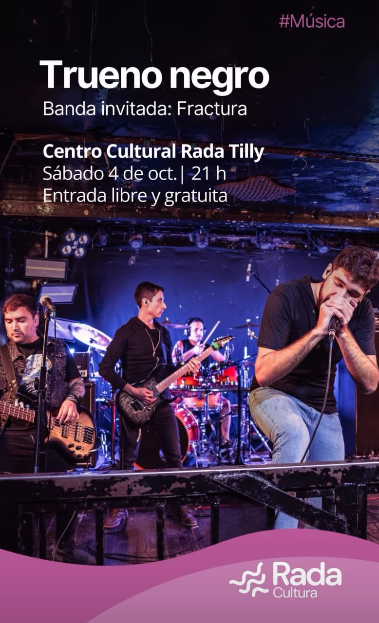 Banda invitada: Fractura. Lugar: Centro Cultural Rada Tilly. Fecha: Sábado 4 de octubre | Horario: 21:00 hs. Entrada: Libre y gratuita.