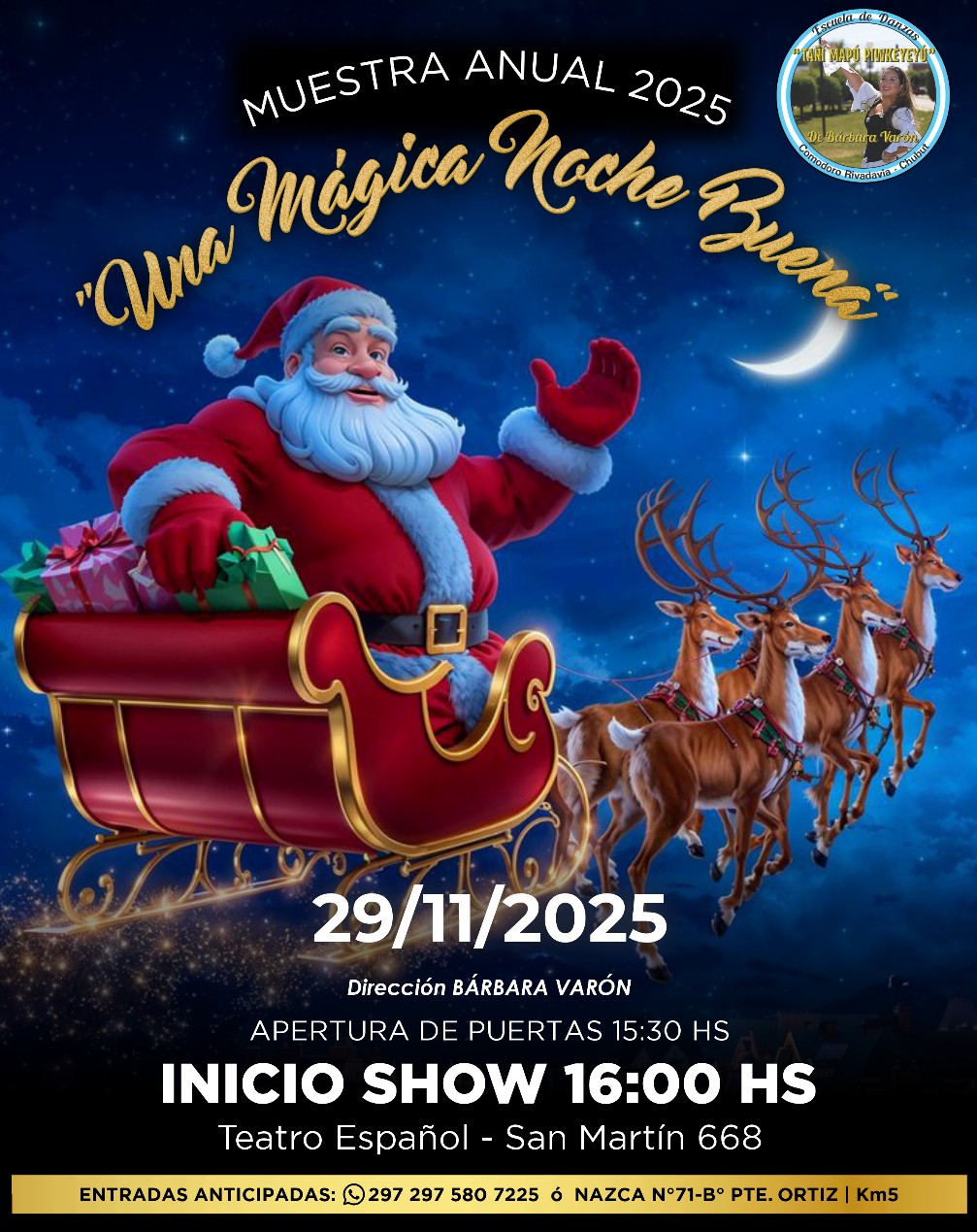 Academia Tañi Mapu presenta su Muestra Anual 2025 “Una mágica noche buena” Fecha: Sábado 29 de noviembre Horario: 16:00 hs Lugar: Cine Teatro Español Instagram: escuela.de
